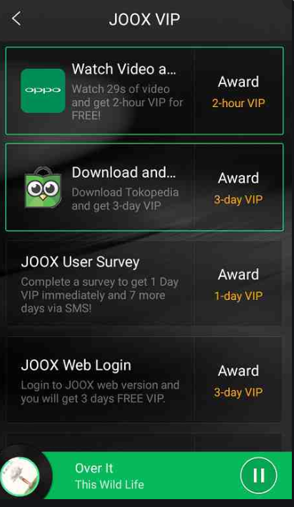 Untuk cara yang ketiga ini, sobat tinggal menyelesaikan tugas yang diberikan oleh pihak JOOX. Untuk melihat dimana tugas yang diberikan, tinggal pergi ke Akun > JOOX VIP. Disini tinggal sobat lihat saja tugas yang diberikan oleh joox seolah-olah gambar dibawah ini